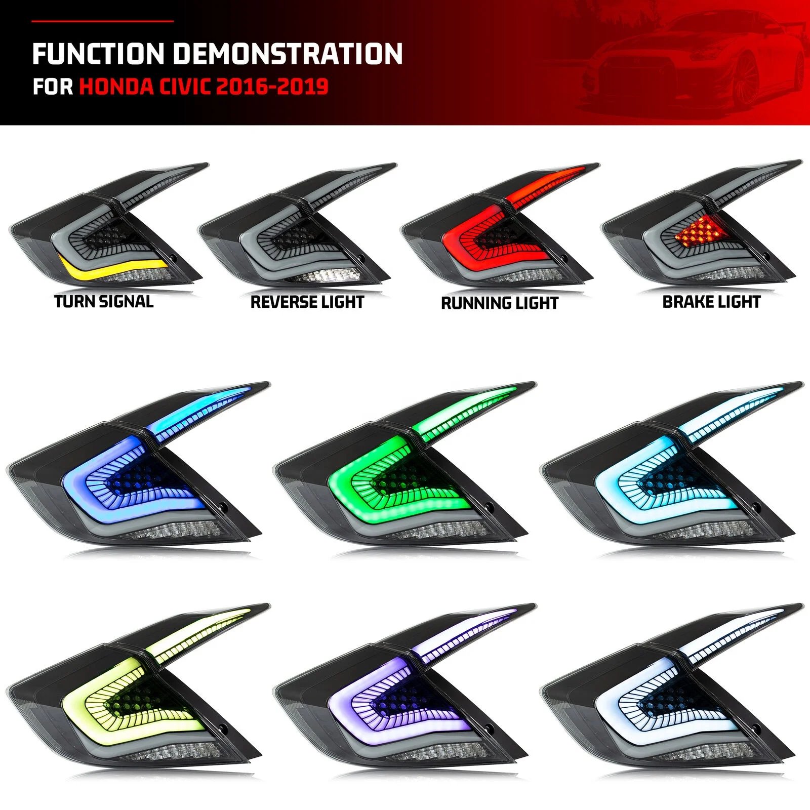 - Function : Running Turn Brake Reverse Reverse:White. Turn: Yellow. Brake: Red